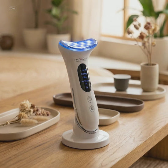Experience visible lifting, smoother skin, and a rejuvenated neckline with the RadiaVita YC170 Neck & Face Beauty Device, an advanced 4-in-1 beauty tool designed to tighten, tone, and revitalize your skin through a combination of LED light therapy, EMS microcurrent stimulation, and soothing thermal vibration massage.