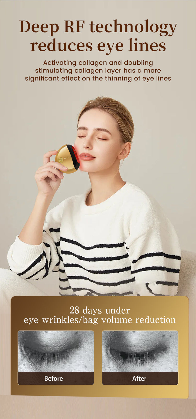 Smooths Fine Lines & Eye Wrinkles – Deep RF and EMS activation remodels collagen.